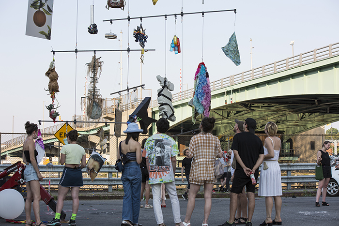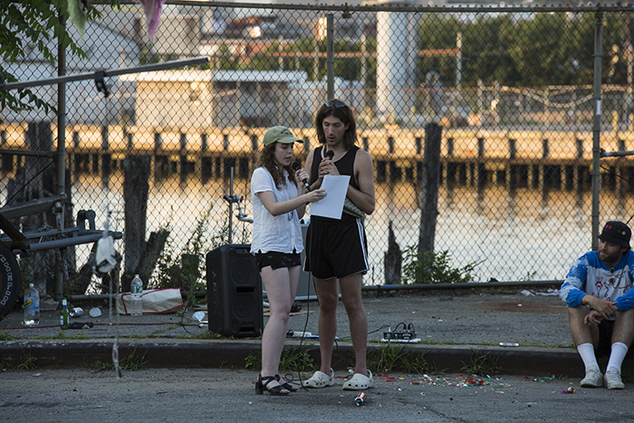 Cul De Sac is a new venue, where Greenpoint Avenue dead ends at the newtown creek under the greenpoint avenue bridge. It serves as a hub for the DOT bridge inspection unit but it’s also a quiet spot for nomads to congregate and cops to get blowjobs. Dead ends create streets for people (rather than for cars) by disrupting the constant flow of traffic on roads. This one in particular is a place for reflection: stop, look around, see the buildings turned upside down on the surface of the water. Being there among the curved curbs viewable from all sides feels like being on a coliseum floor or in a circus ring - the perfect location for a summer situation.