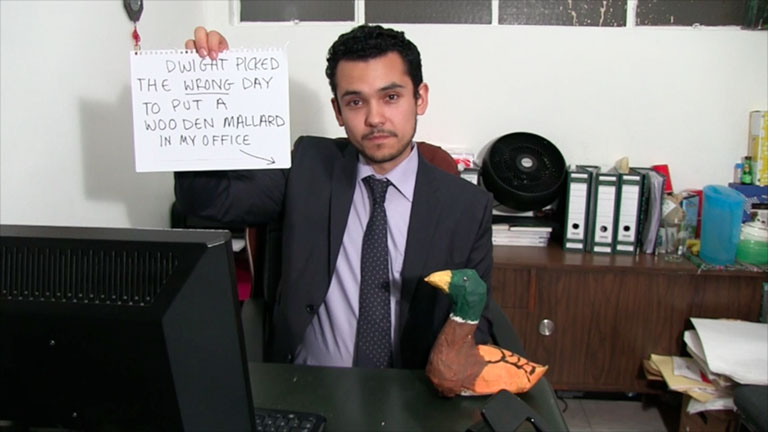 episode of TV show the office re-shot after hours in an accountant's office starring new friends. New video projected from corner office window for 3 nights.